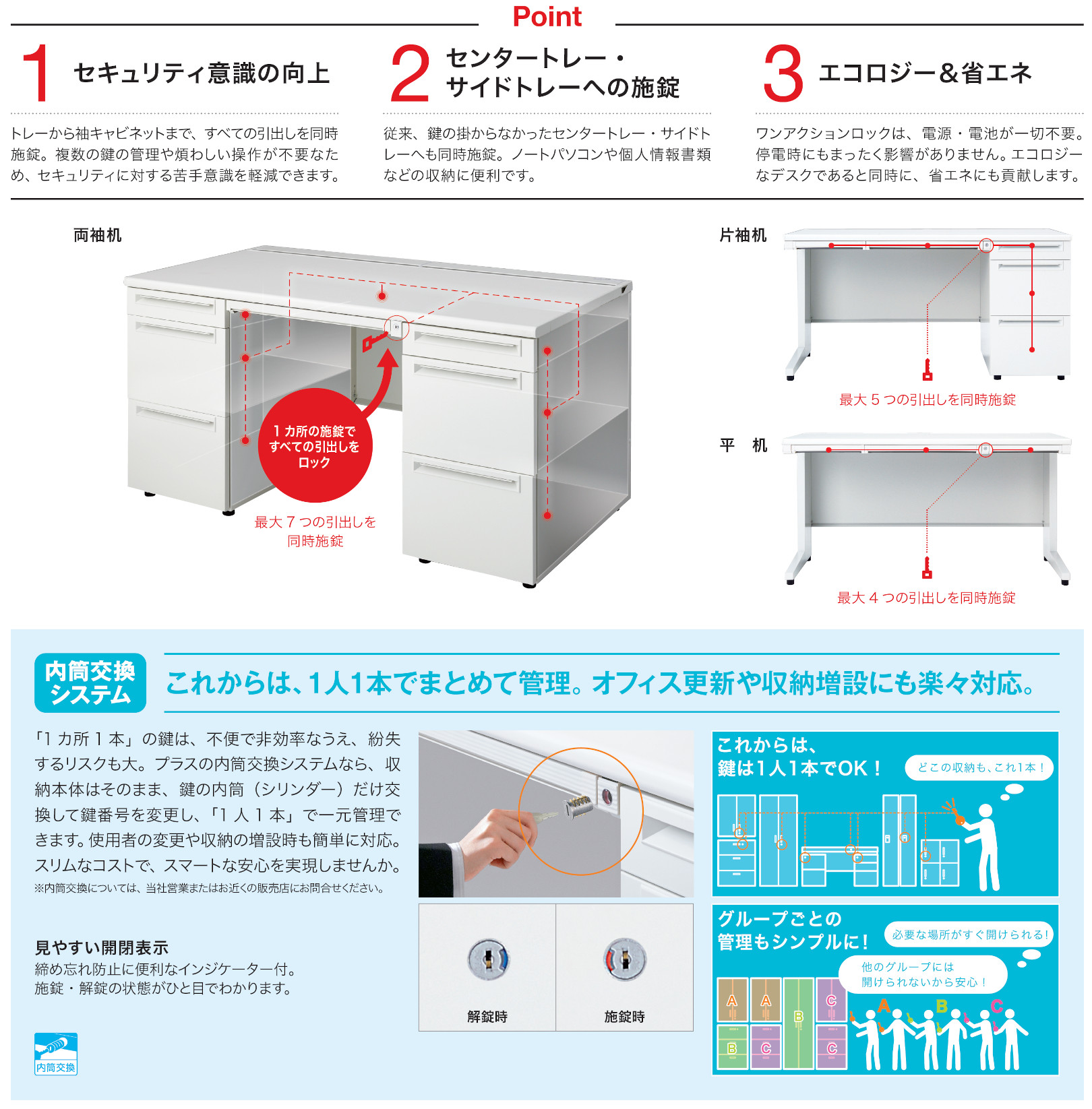 ●全段ラッチ付、オールロック機構、開閉表示付、シンメトリーキー *、内筒交換対応