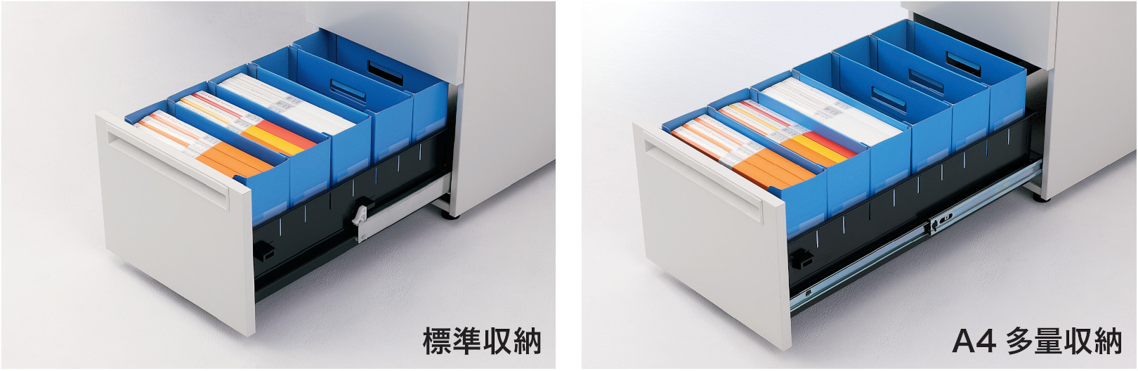 標準収納タイプはA4ボックスファイルを5個、A4多量収納タイプは6個収納できます。