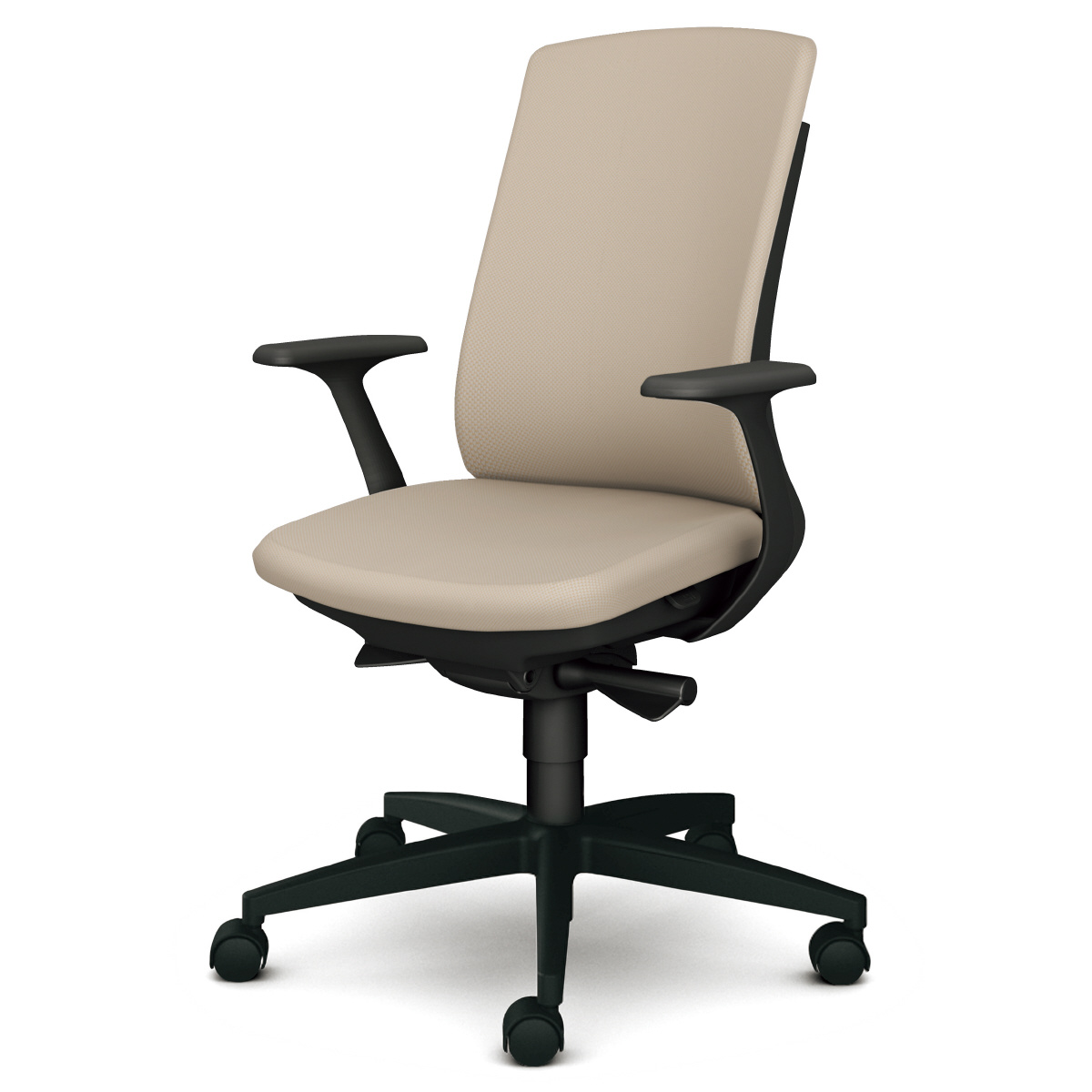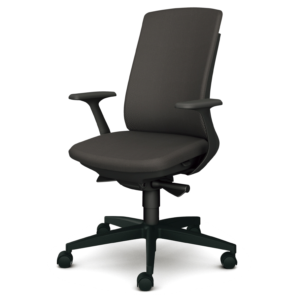 布張り ダークグレーフレーム ハイバック 固定肘 樹脂脚美しくS字にカーブした背と座面、座り心地にこだわるとこのデザインにいきつく。