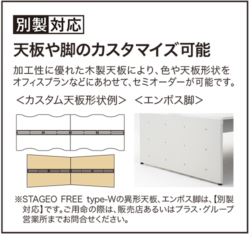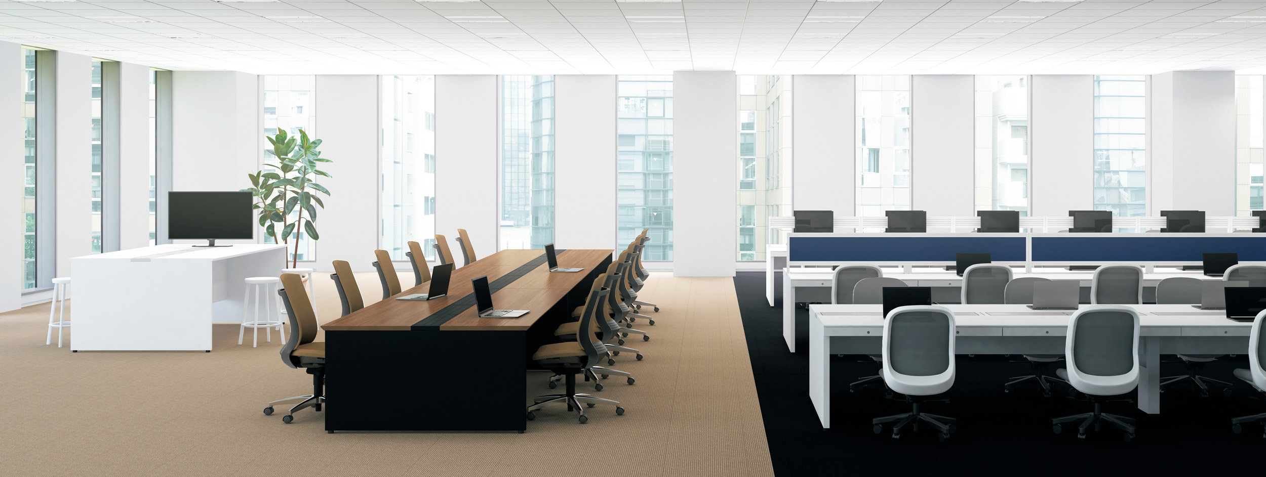 天板の継ぎ目が目立たず自由な座席設定ができる大型デスク。フリーアドレス席やタッチダウンスペースに最適です。